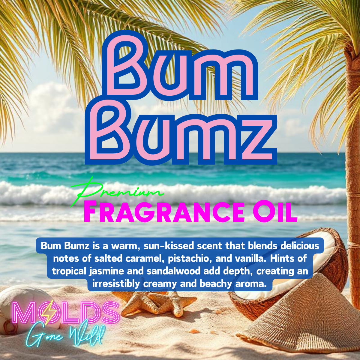 Bum Bumz is a warm fragrance featuring notes of salted caramel, pistachio, and vanilla. It’s a deliciously sweet, beachy scent with a touch of warmth and sensuality, inspired by the vibrant energy of Brazil.