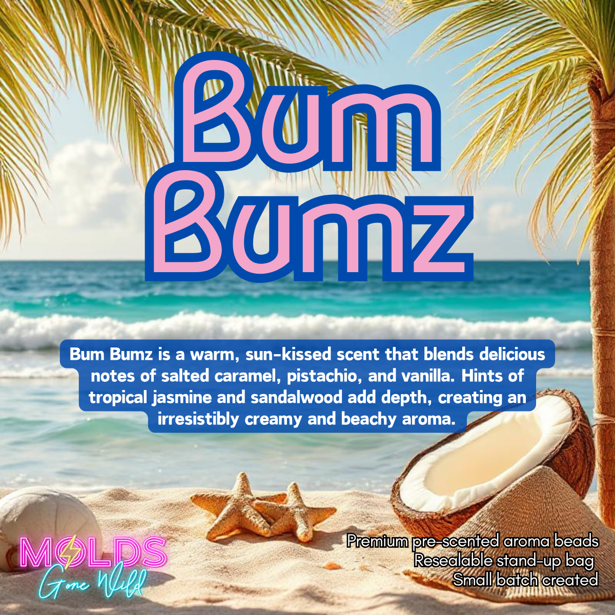 Bum Bumz is a warm fragrance featuring notes of salted caramel, pistachio, and vanilla. It’s a deliciously sweet, beachy scent with a touch of warmth and sensuality, inspired by the vibrant energy of Brazil.